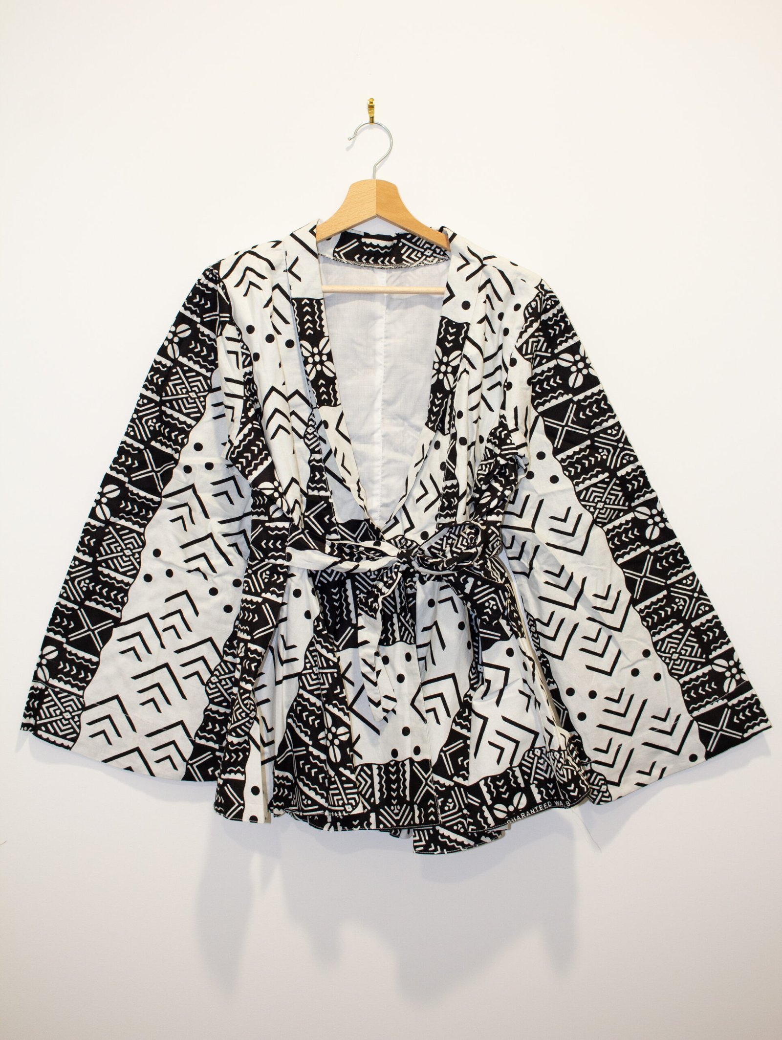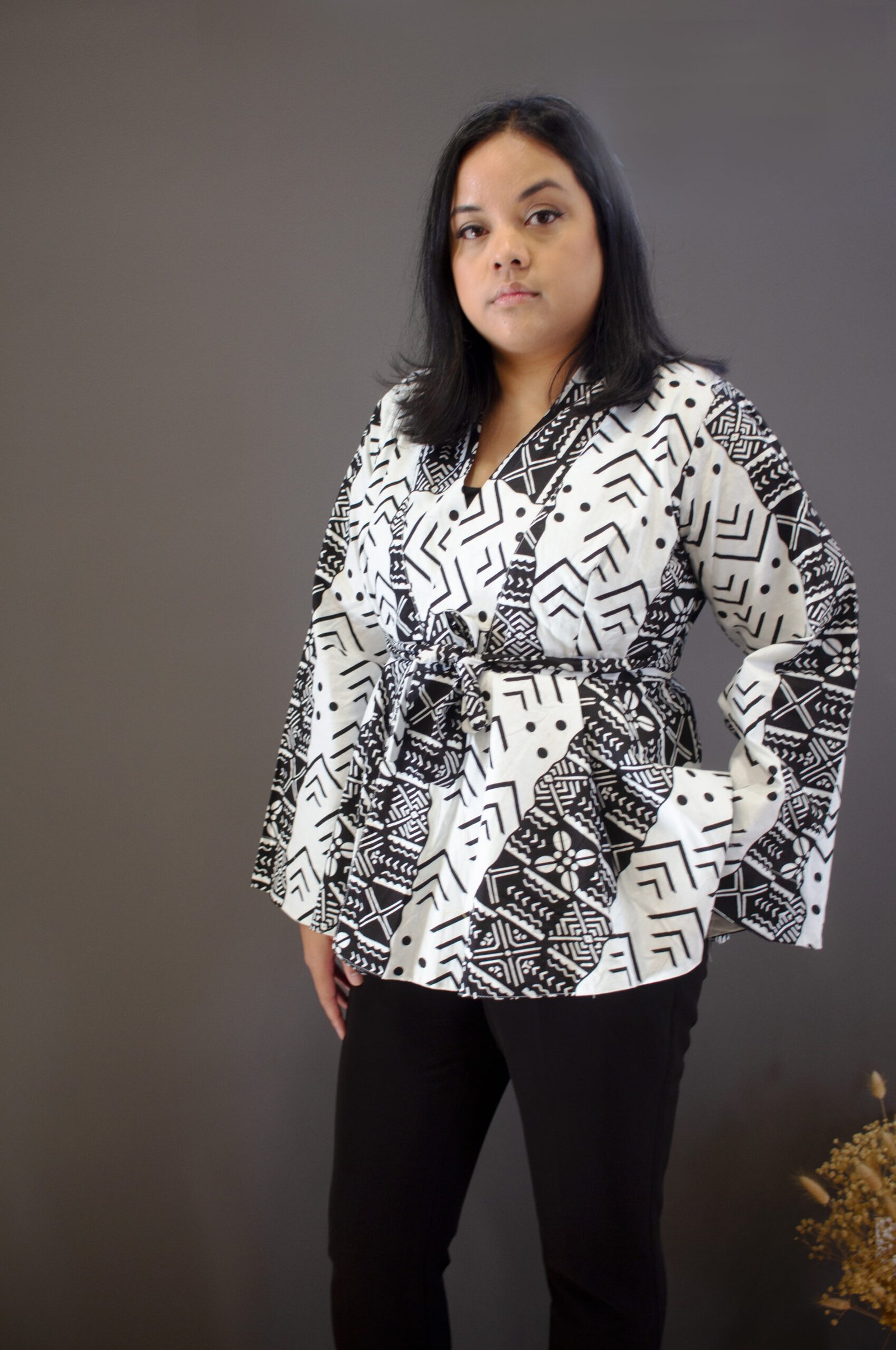 Élégant et raffiné, ce cache-cœur en wax blanc aux motifs noirs très fins allie subtilité et modernité. Fait main au Sénégal, en 100% coton, il offre confort, légèreté et style. Porté fermé, il souligne la silhouette avec grâce et structure, pour un look chic et affirmé.